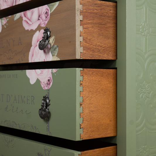 Hand-Painted Vintage Chest of Drawers | Soft Sage Green with Rose Floral Detailing