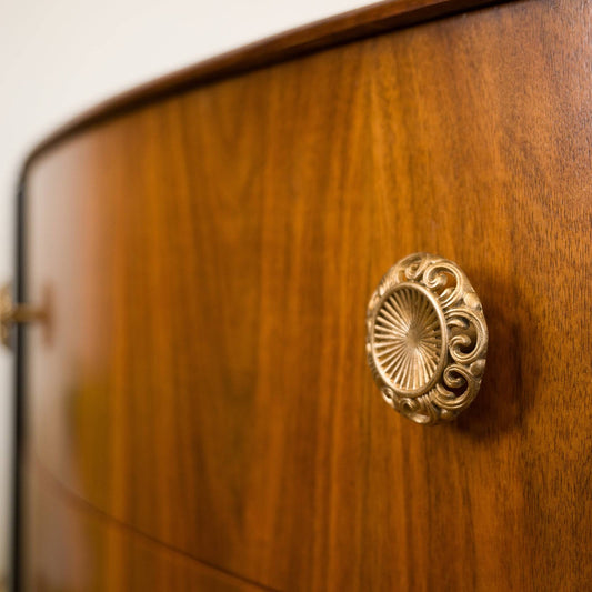 Vintage Walnut & Black Bow Front Chest of Drawers – Art Deco Upcycled Furniture with Gold HandlesRegular price £495.00 GBPRegular priceUnit price per-