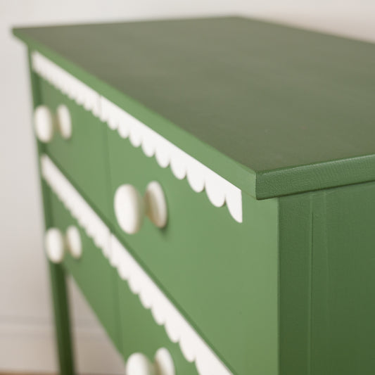Whimsical Green and White Scalloped Trim Chest of Drawers, Console Table - Hand-Painted Statement FurnitureRegular price £295.00 GBPRegular priceUnit price per-