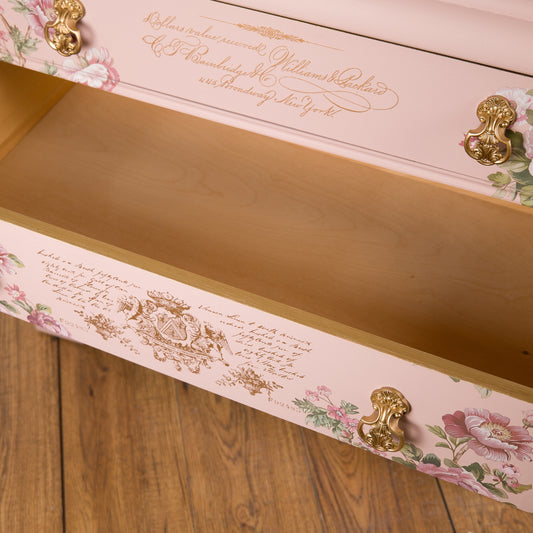 Romantic Vintage Upcycled Blush Pink Floral Chest of Drawers with Gold Detailing and Floral TransfersRegular price £425.00 GBPRegular priceUnit price per-