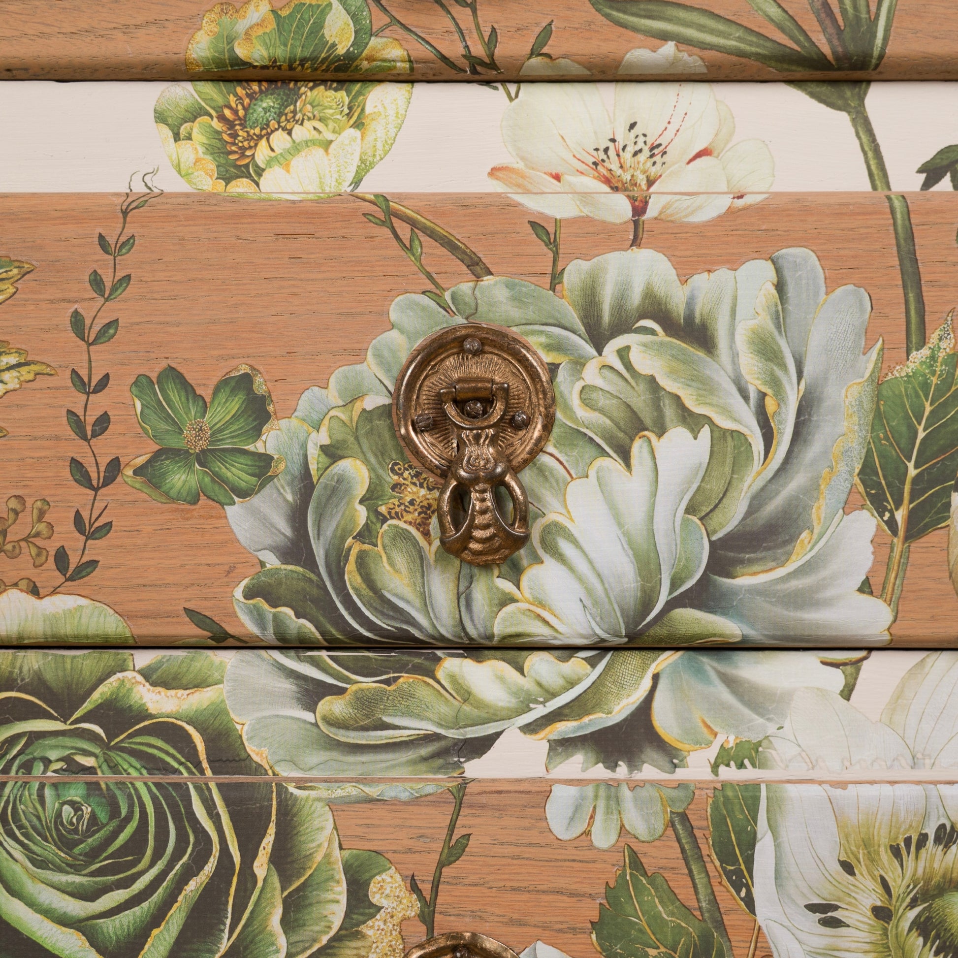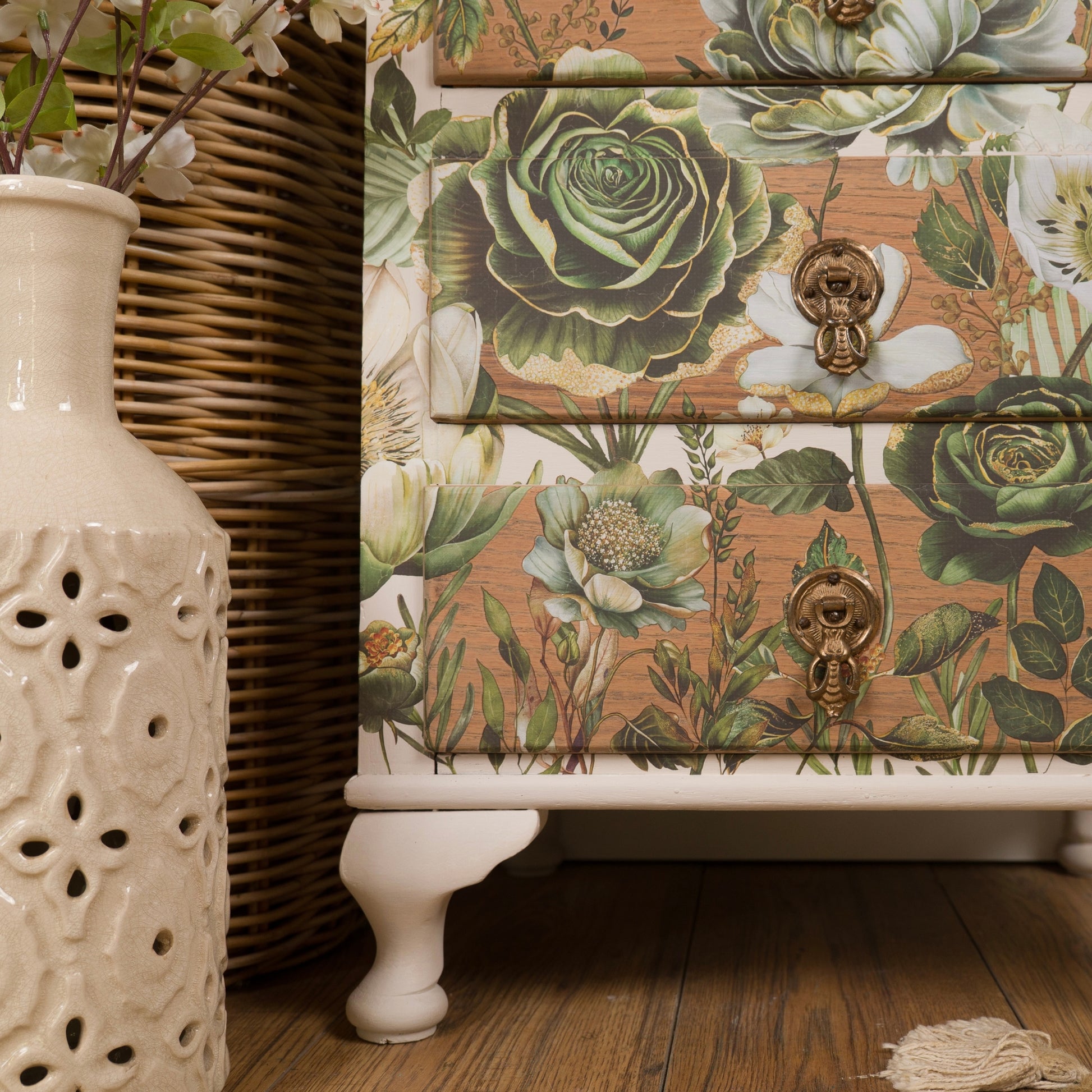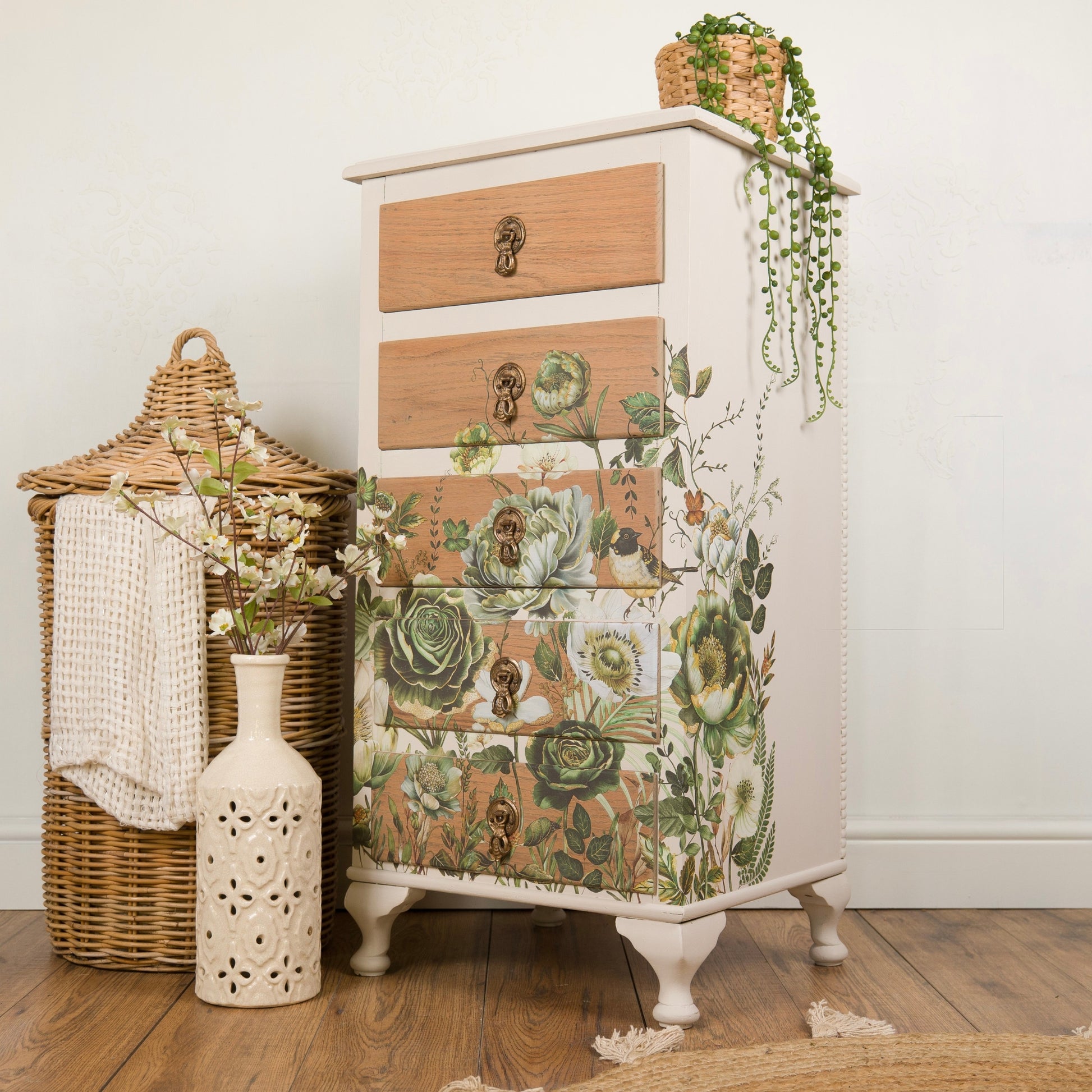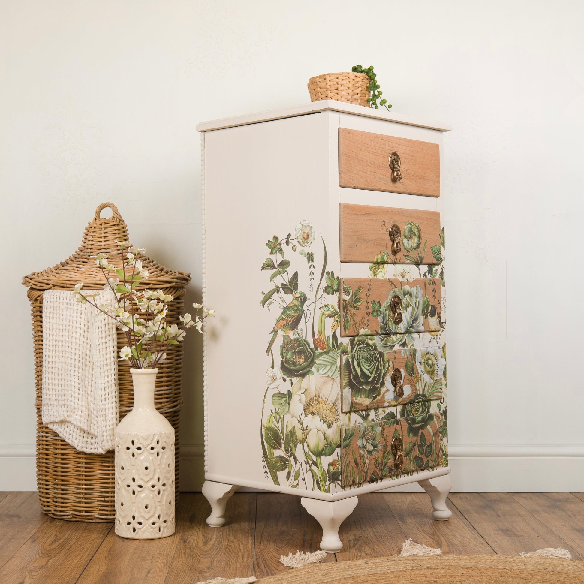 Bring charm and character into your home with this beautifully upcycled chest of drawers. Hand-finished in a soft, timeless neutral with natural wood accents, this piece has been lovingly transformed with a stunning floral transfer design featuring lush green botanicals and delicate blooms.
