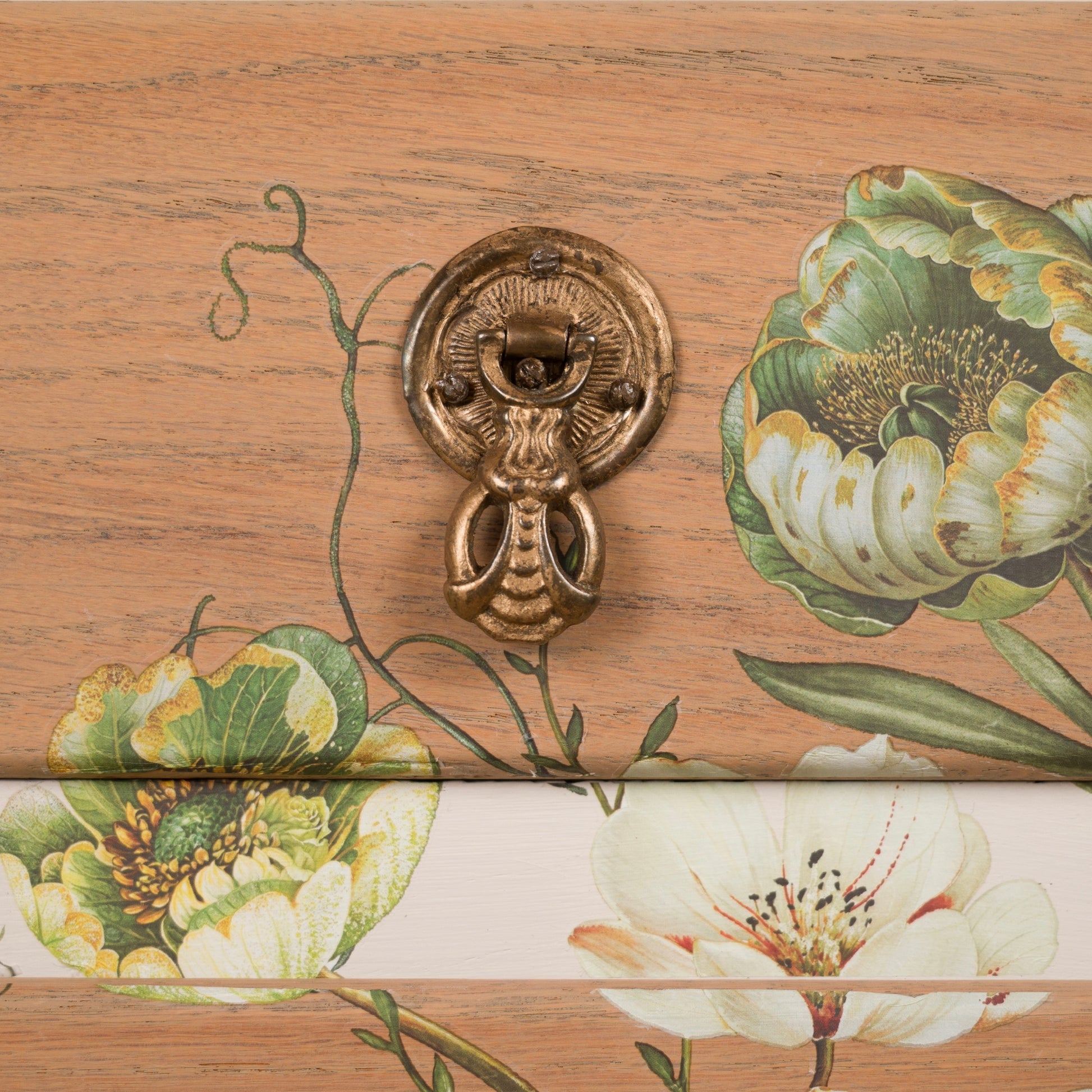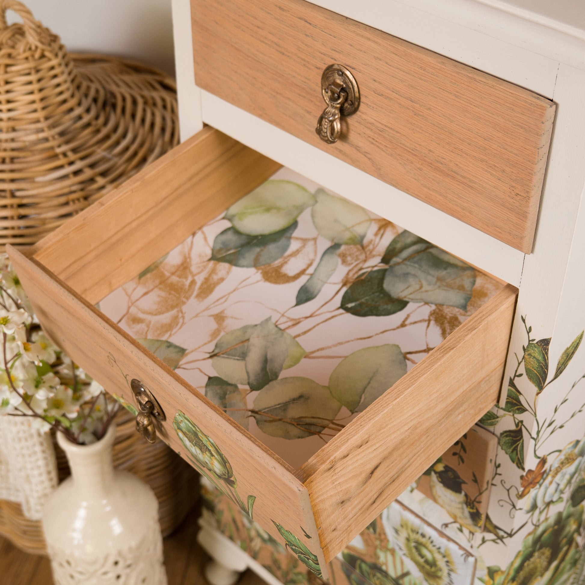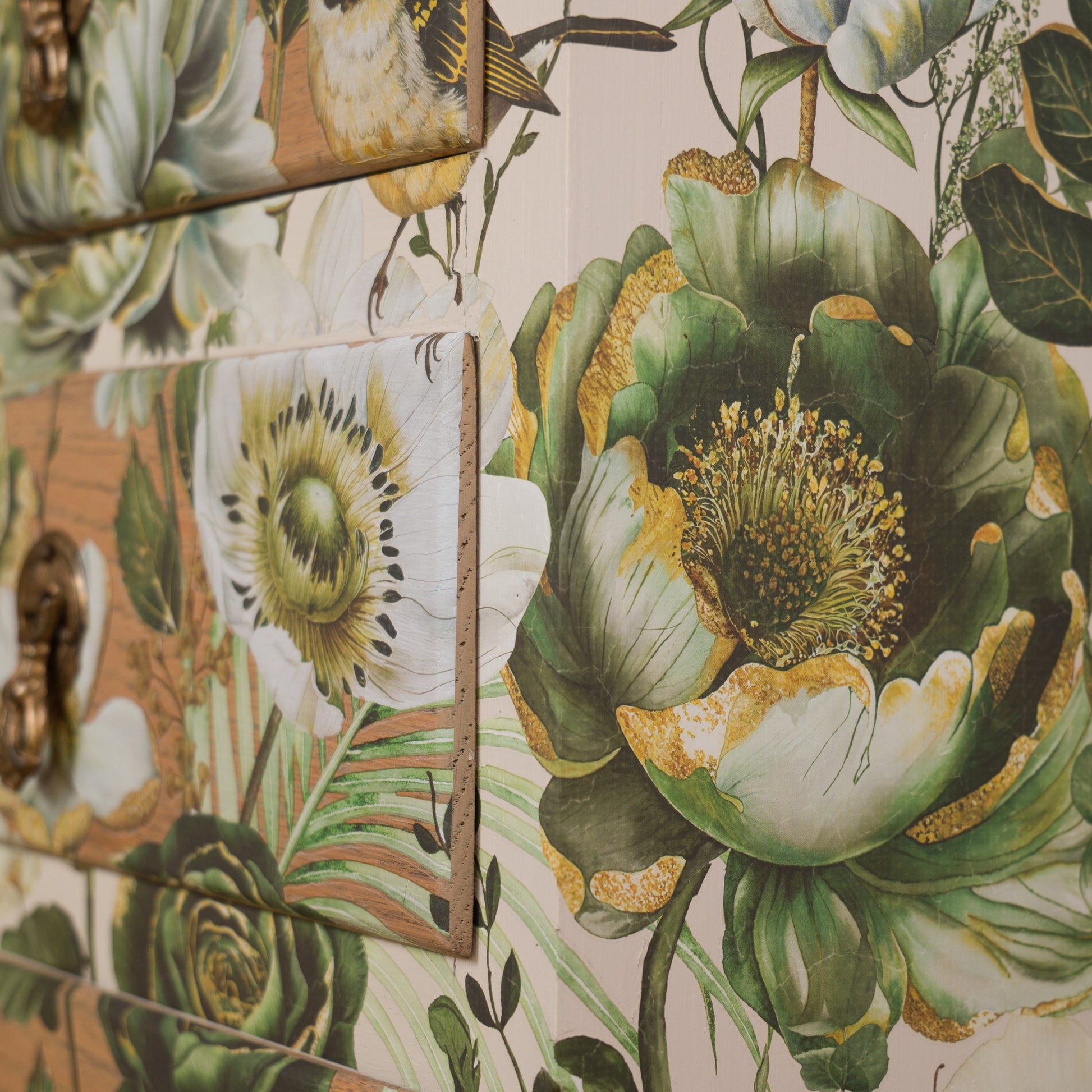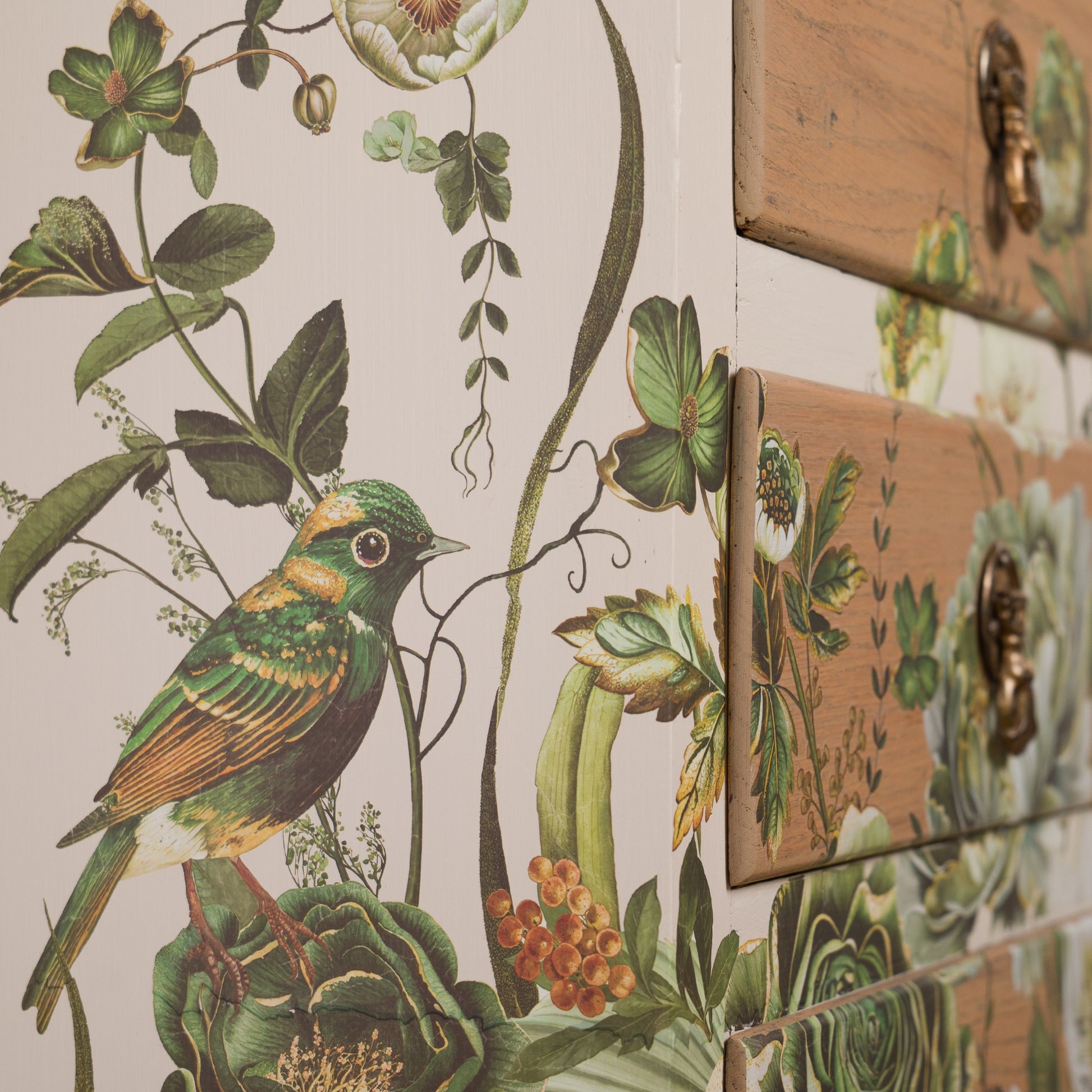 Bring charm and character into your home with this beautifully upcycled chest of drawers. Hand-finished in a soft, timeless neutral with natural wood accents, this piece has been lovingly transformed with a stunning floral transfer design featuring lush green botanicals and delicate blooms.