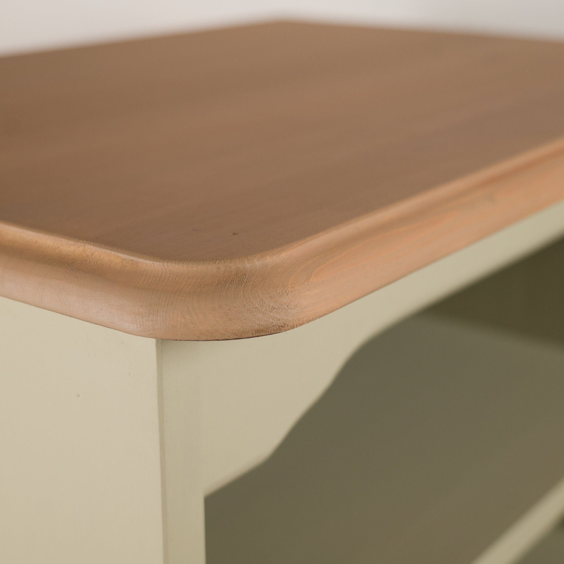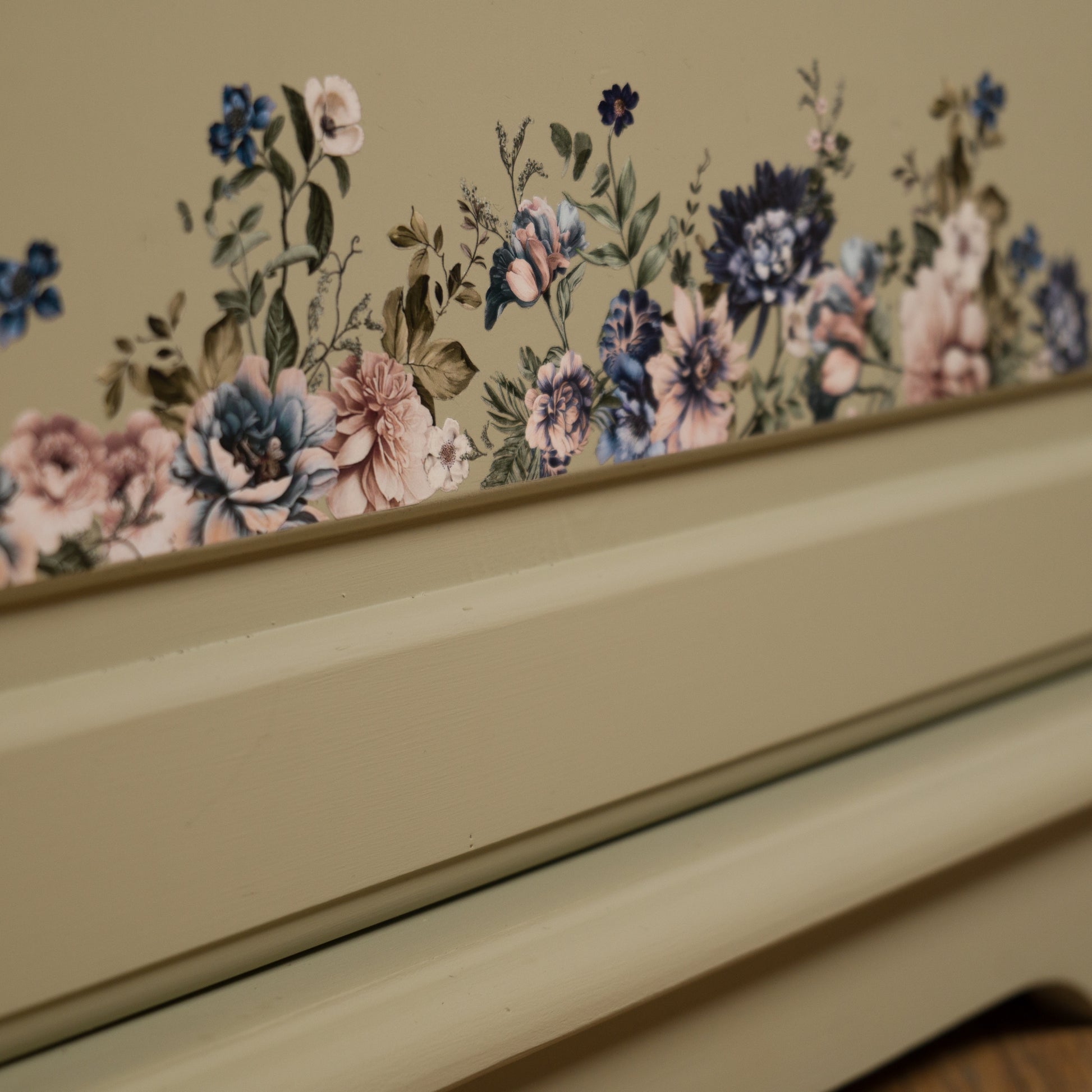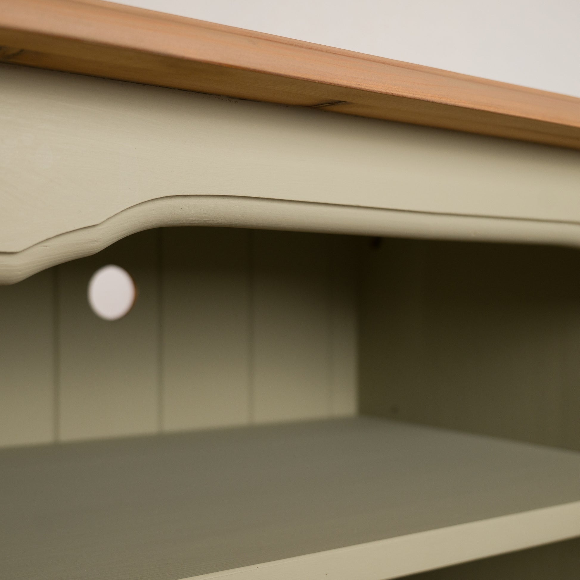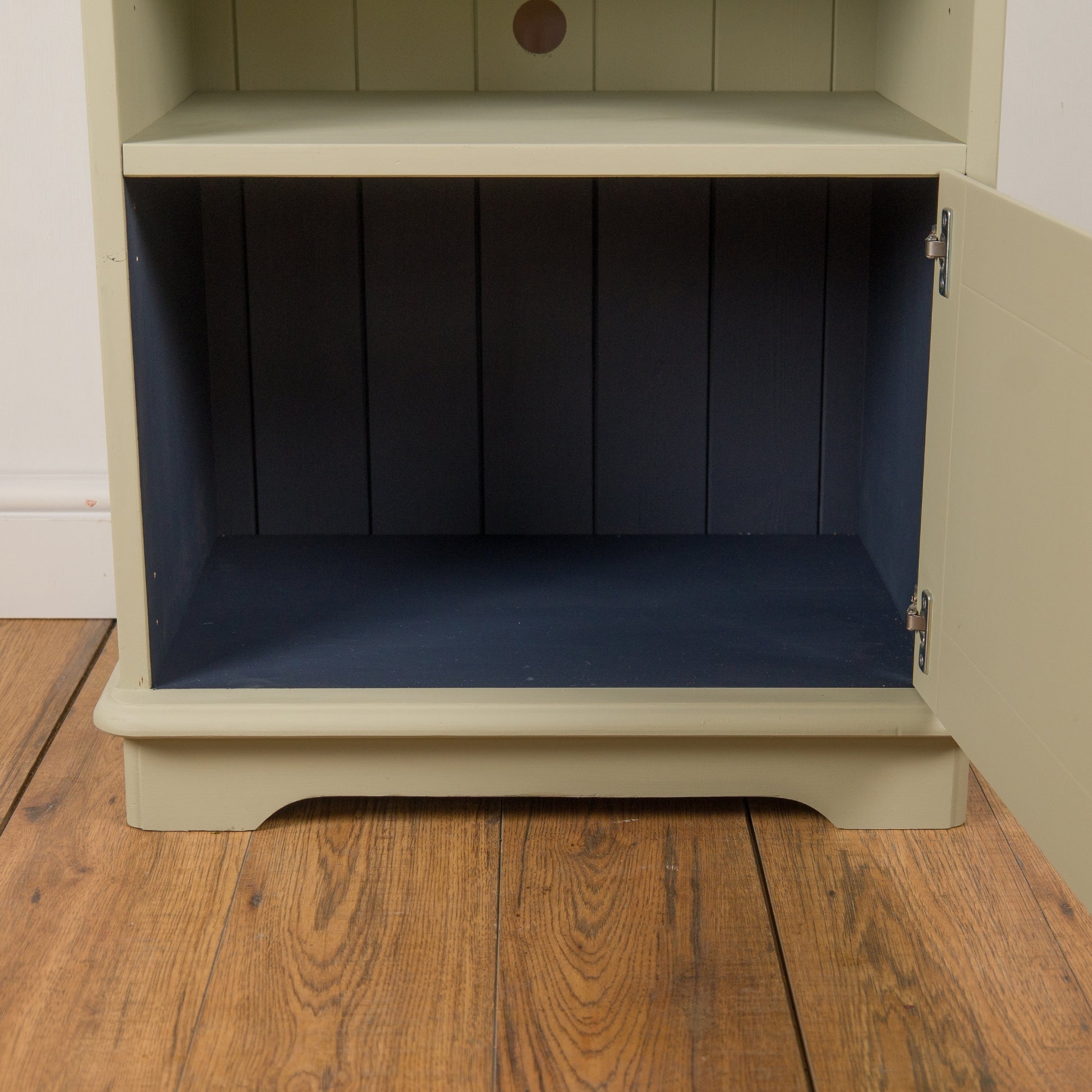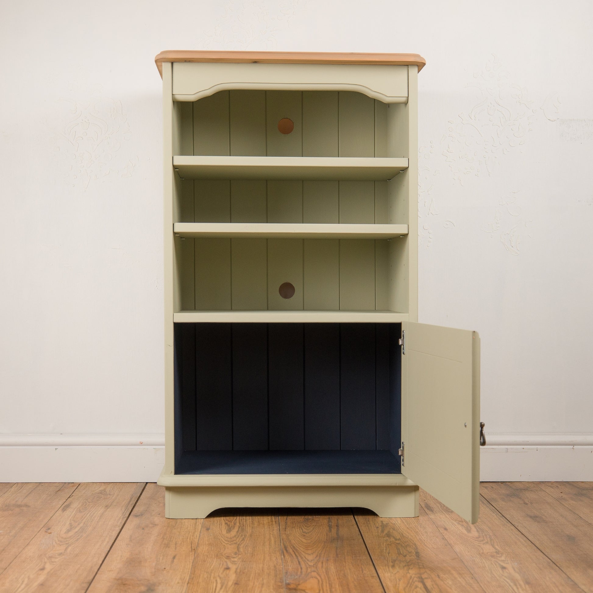 Inside, open shelving provides practical storage while the lower cupboard features a delicate floral detail, adding subtle charm without overpowering the piece. Every surface has been carefully prepared and hand-finished, making this a truly one-of-a-kind item.