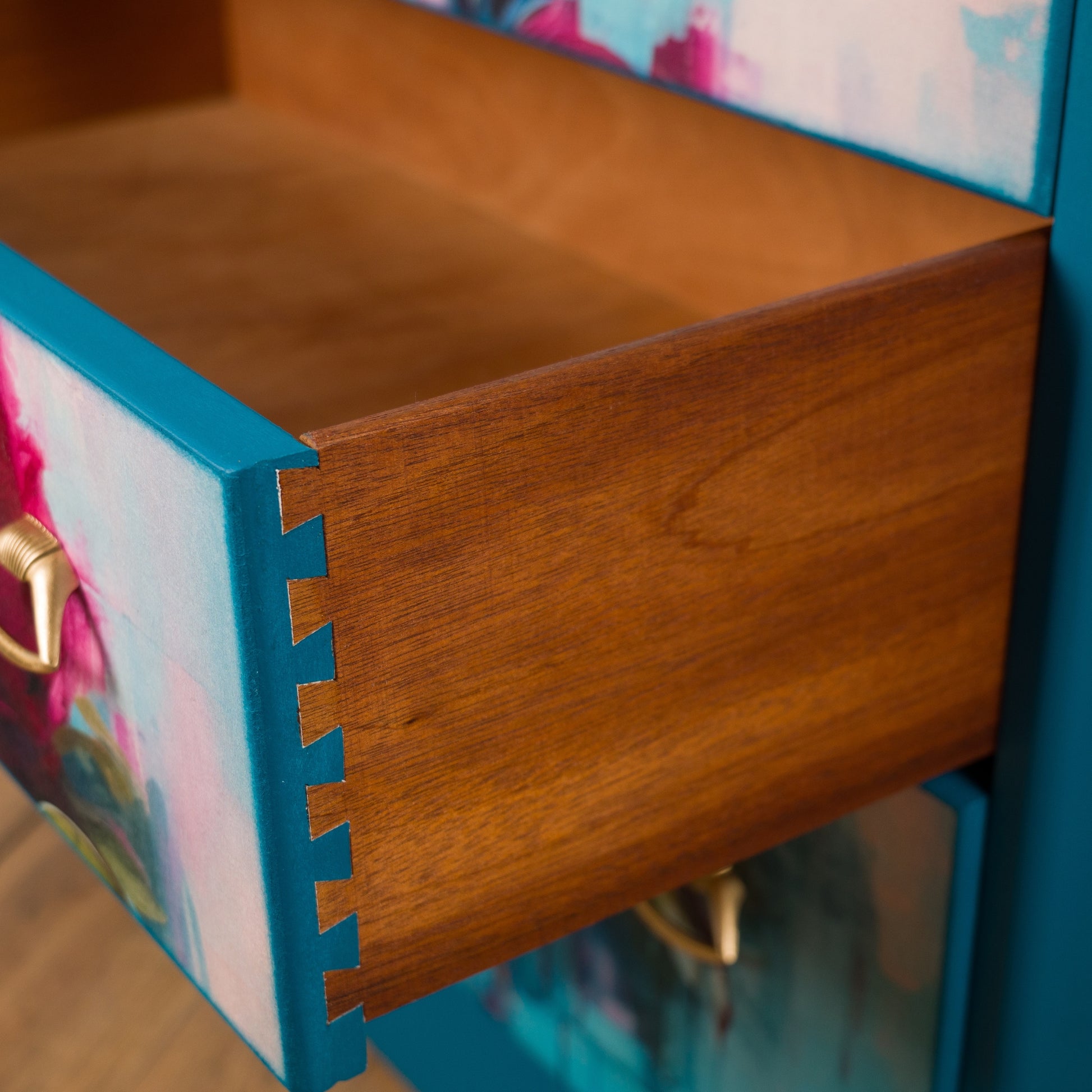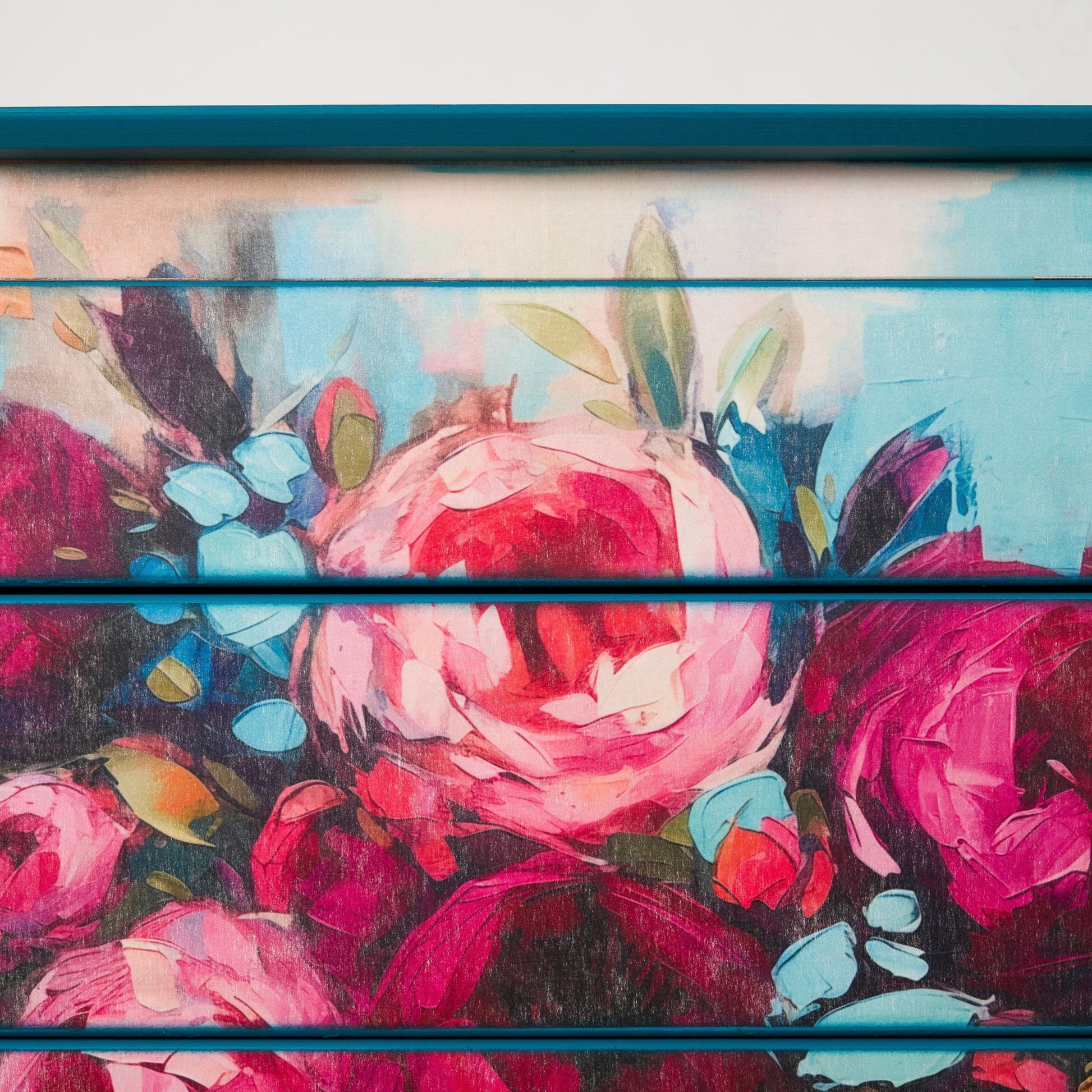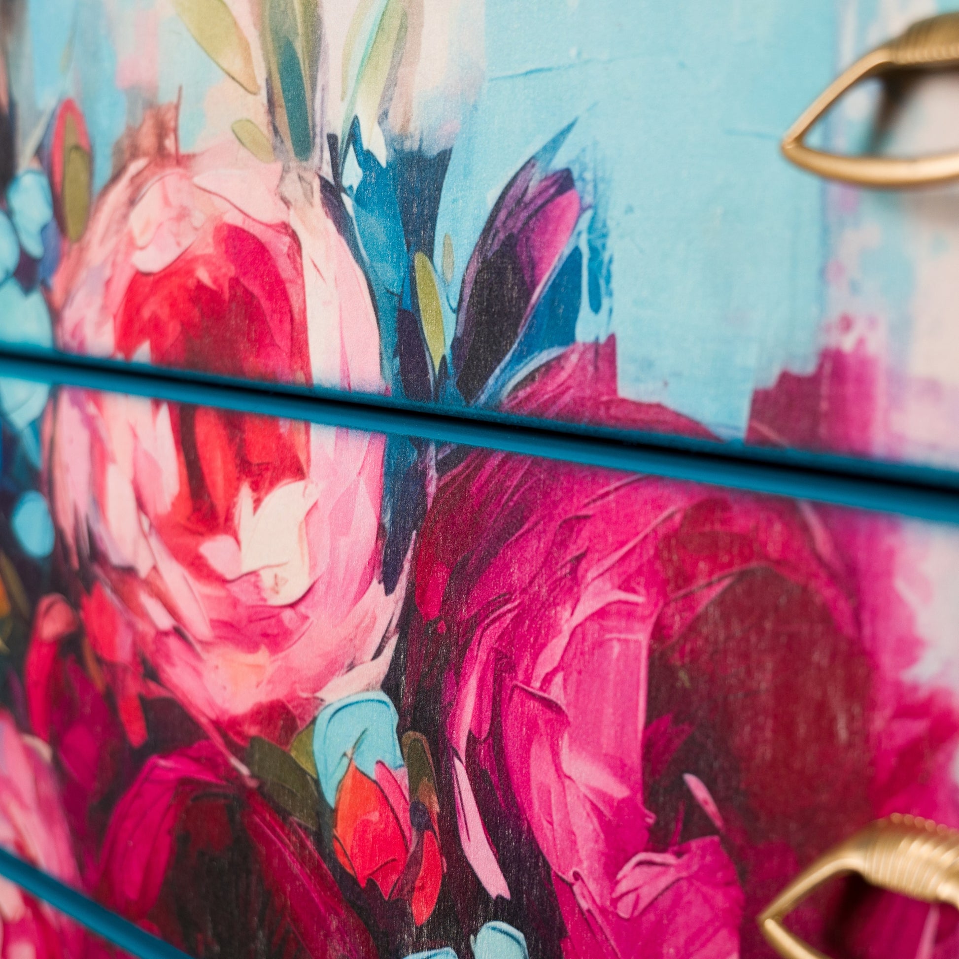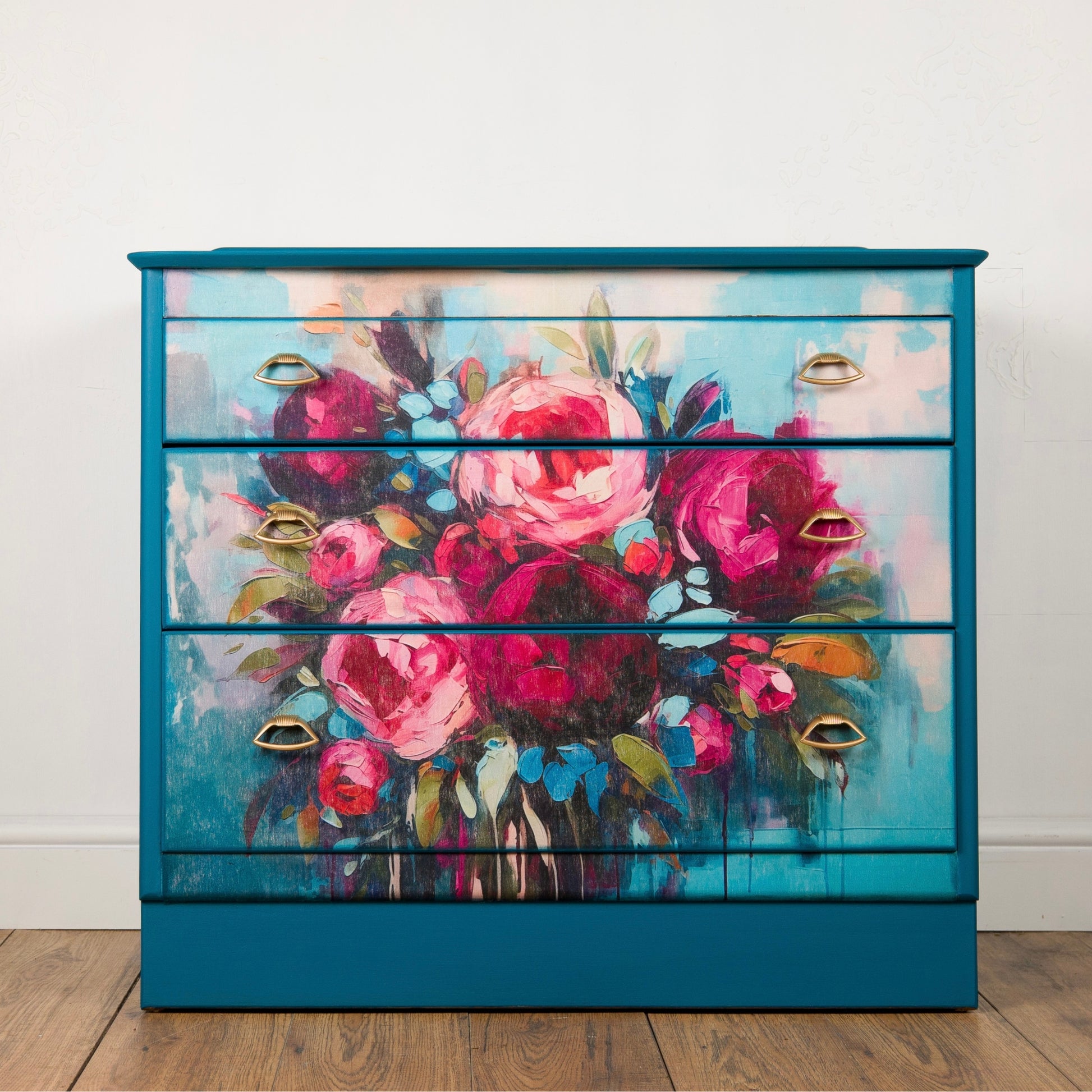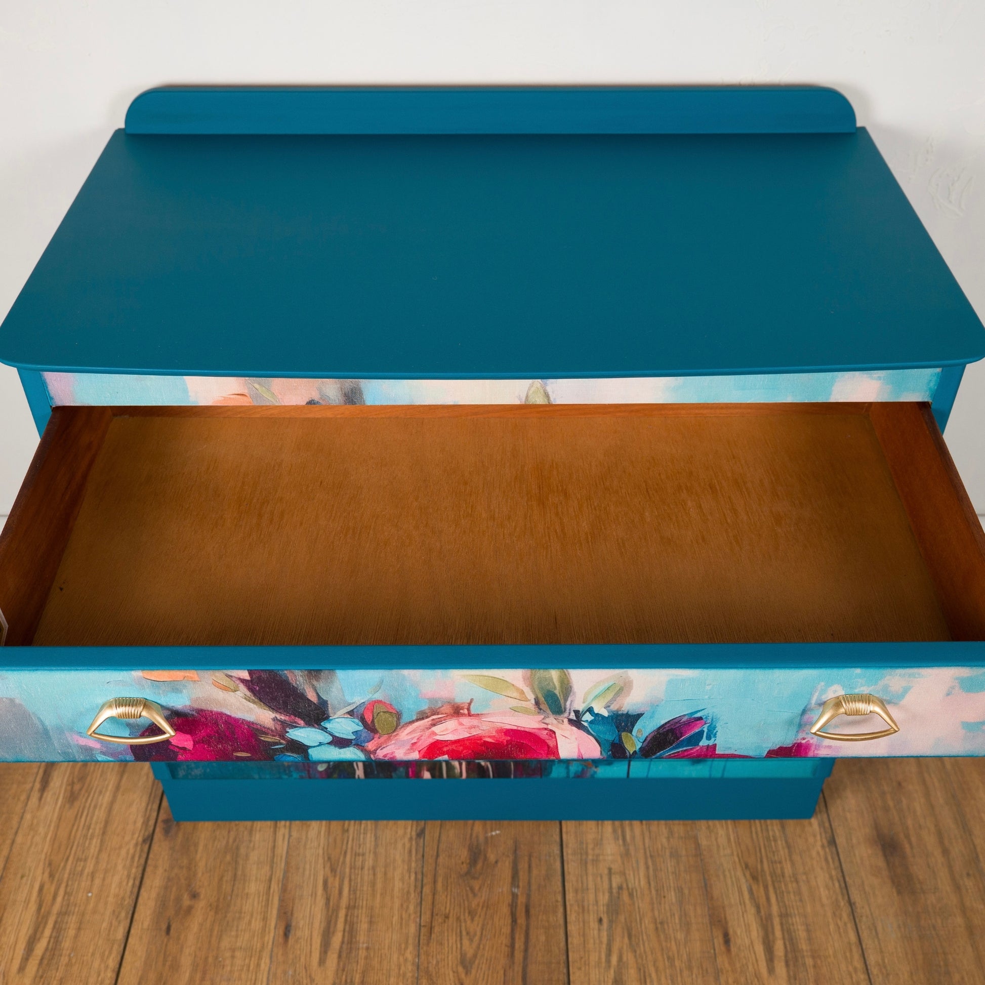 This one-of-a-kind vintage chest of drawers has been lovingly transformed into a true statement piece. Finished in a rich teal blue, it features a striking floral decoupage design across the drawer fronts, bursting with layered pinks, reds and soft foliage tones. The artwork has a painterly, expressive feel, giving the piece depth, movement and character from every angle.
